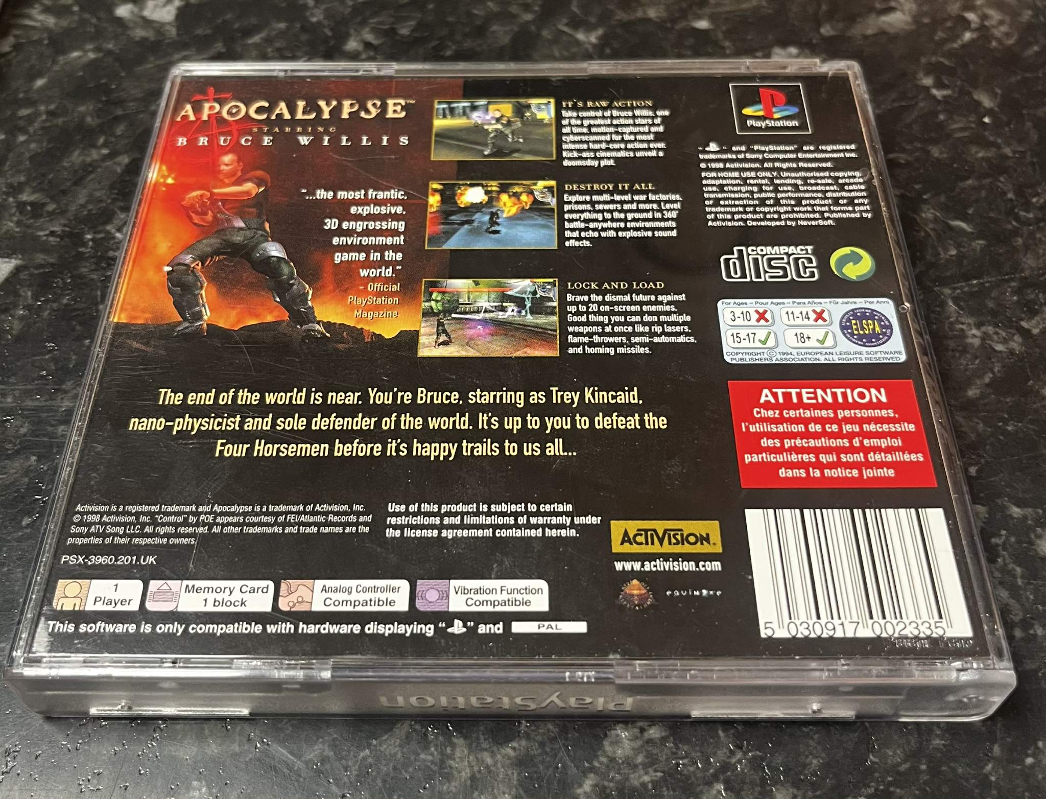 Apocalypse (PS1) on räjähtävä toimintapeli, jossa taistelet maailmanlopun kynnyksellä loputtomia vihollisjoukkoja vastaan. Ohjaa sankaria, jonka äänenä kuullaan Bruce Willis, ja käytä laajaa asearsenaalia tuhotaksesi demoniset voimat. Nopeatempoinen pelattavuus, tuhoutuvat ympäristöt ja synkkä tunnelma tekevät pelistä vauhdikkaan klassikon toimintapelien ystäville.
