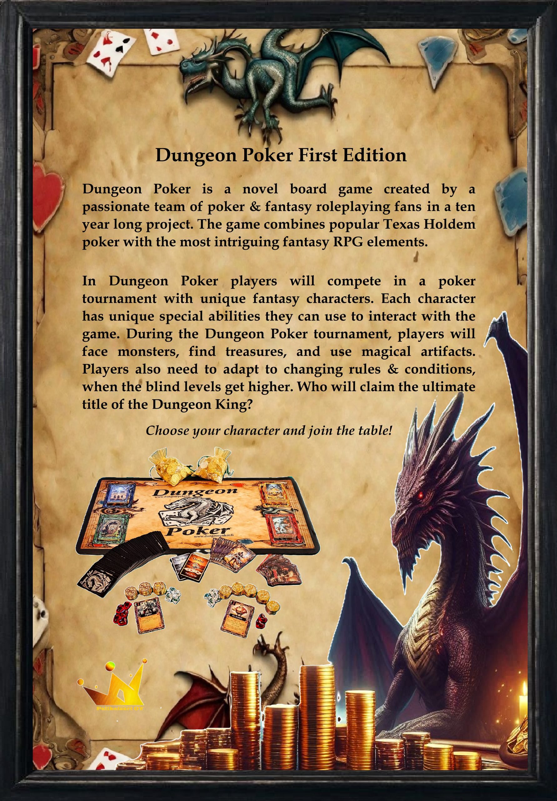 Dungeon Pokerissa kaikki pelaajat valitsevat alussa oman arkkityyppisen pelaajahahmonsa, jolla osallistuvat pokeriturnaukseen. Jokaisella hahmolla on omat erikoiskykynsä, joilla ne voivat vaikuttaa pokerikierroksen kulkuun. Näiden kykyjen käyttö on kuitenkin rajattua, sillä ne kuluttavat hahmon sielunvoimaa, jota kuvataan pelissä arvokkailla sielukivillä. Pelin aikana pelaajat kohtaavat toinen toistaan vaarallisempia hirviöitä, löytävät aarteita ja käyttävät mitä erilaisimpia taikaesineitä. Pelaajien on myös jatkuvasti sopeuduttava sokkopanostasojen nousun myötä muuttuviin olosuhteisiin.