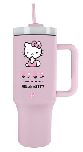 Upea vaaleanpunainen termosmuki, jota koristaa Hello Kitty.