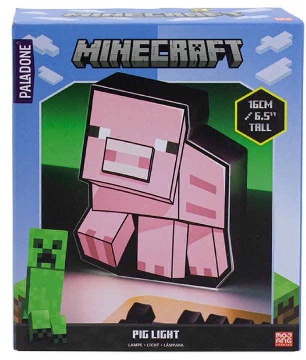 16 cm korkuinen vaaleanpunainen valo on muotoiltu Minecraftin possu-mobin mukaan. Kulmikkaan eläimen tunnusomainen ulkonäkö on painettu laatikkotyylisen hahmovalaisimen etupuolelle.