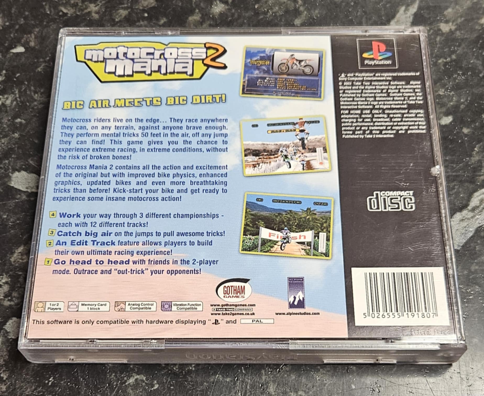 Motocross Mania 2 (PS1) tarjoaa vauhdikasta ja temppupainotteista motocross-ajoa, jossa kisataan näyttävissä ympäristöissä ja haastetaan fysiikan rajat. Suorita hurjia hyppyjä, kerää pisteitä näyttävillä tempuilla ja kilpaile voitosta erilaisissa pelitiloissa. Helppo pelattavuus ja arcade-henkinen meininki tekevät pelistä loistavan valinnan vauhdikkaan ajamisen ystäville.