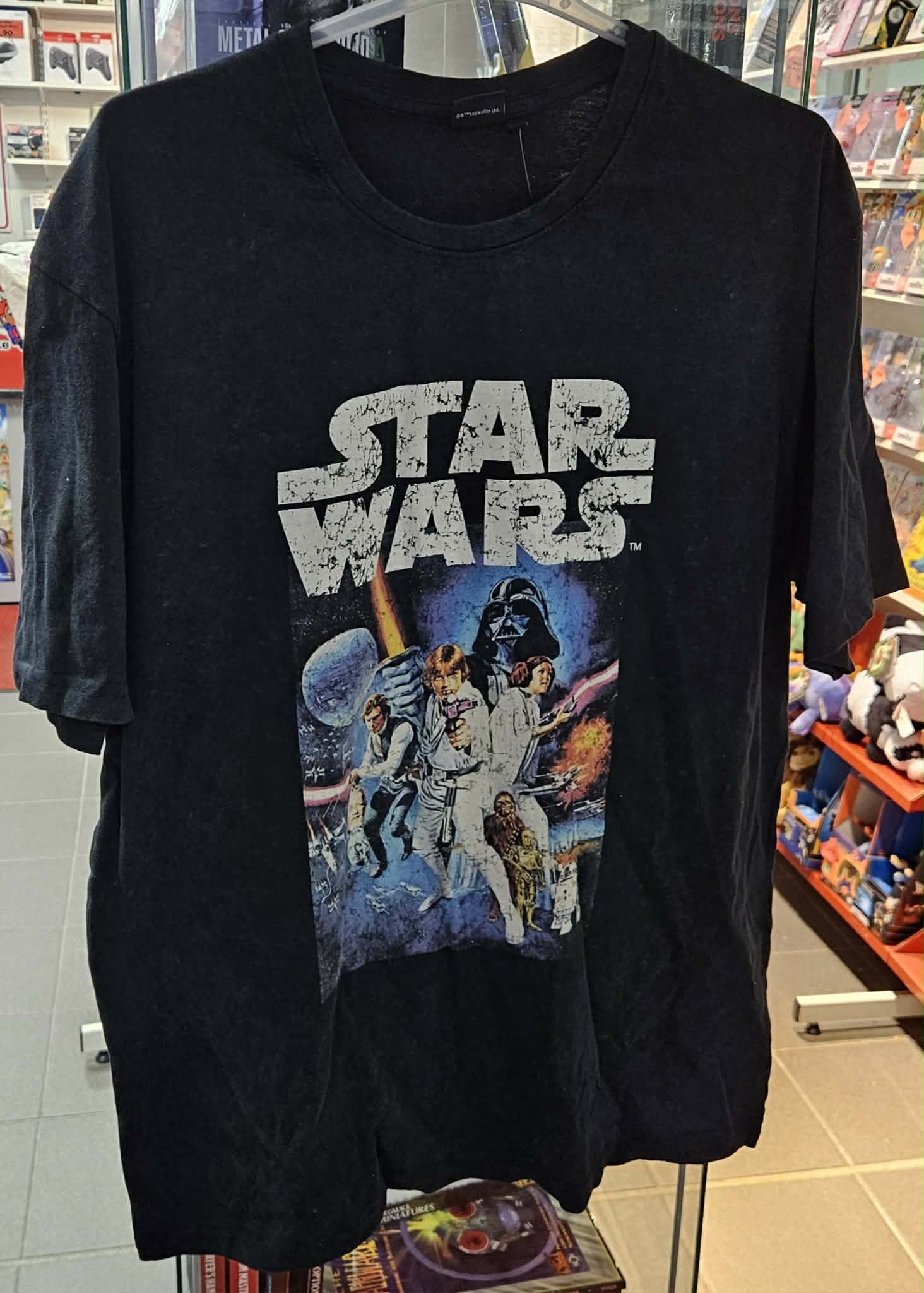 Aikuisten musta T-paita, jota koristaa Star Wars IV: A New Hope -elokuvan kansitaide. Painatus on tehty hienosti retrohenkeä kunnioittaen ” ajan kanssa kulahtaneen” näköiseksi.