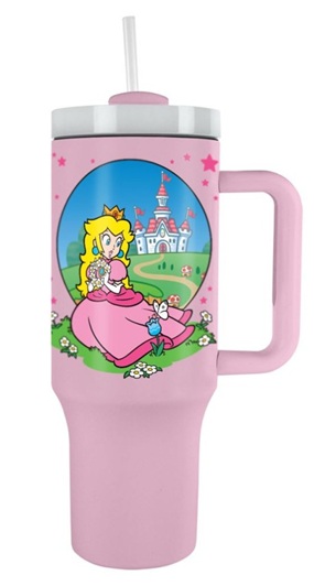 Upea vaaleanpunainen termosmuki, jota koristaa Super Mario-pelisarjasta tuttu sienivaltakunnan hallitsija, Princess Peach.